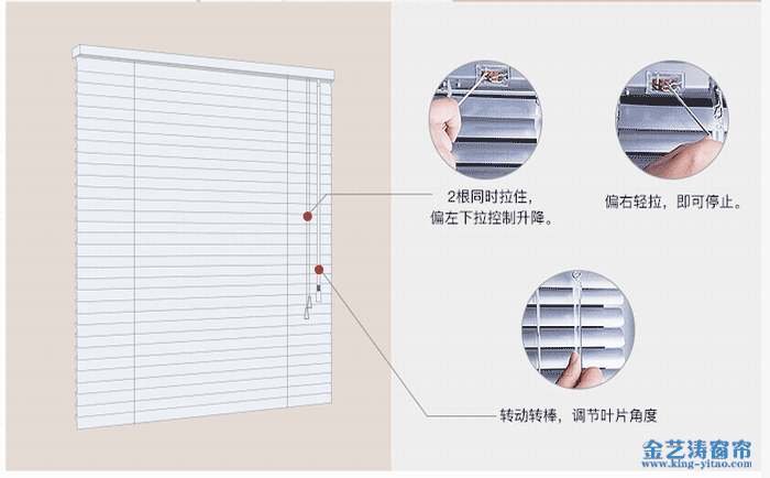 2、拉動百葉窗簾時,握住手柄豎百葉拉動一根拉繩(橫百葉拉動全部拉繩)可將葉片拉開。