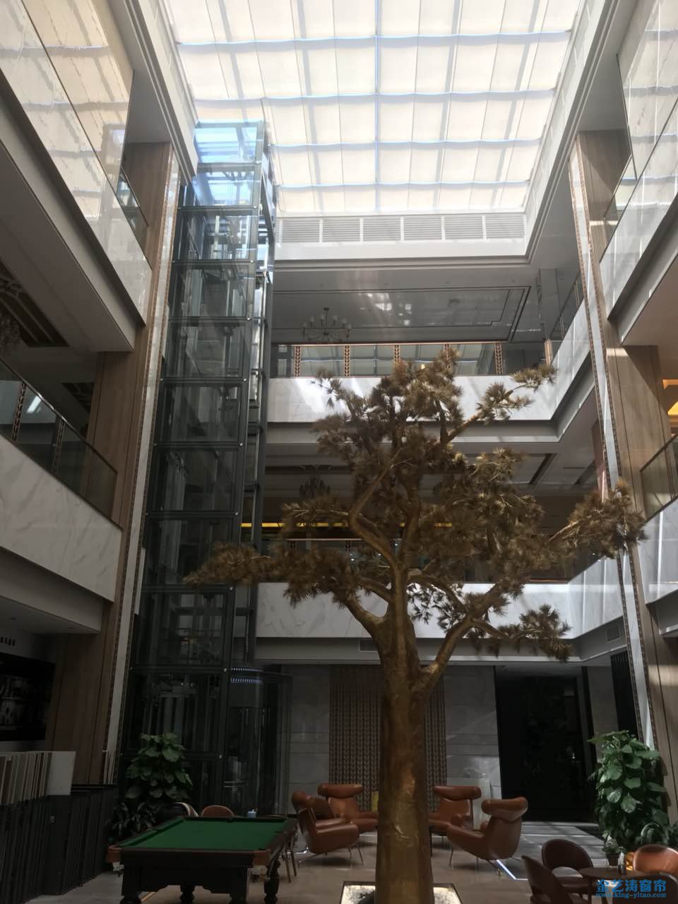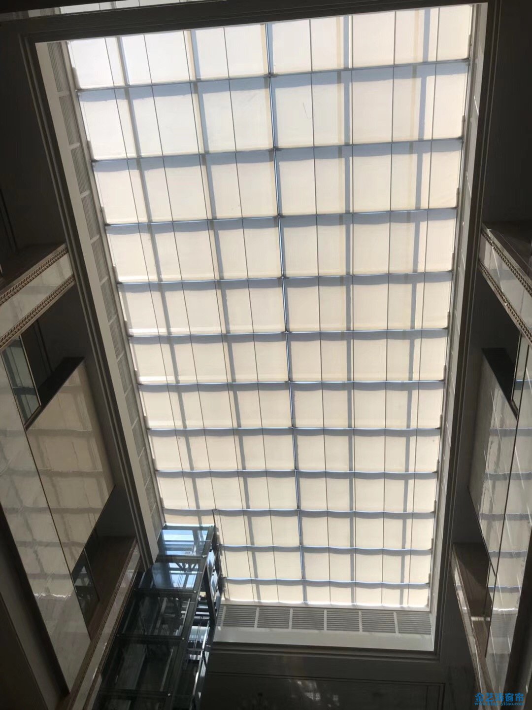 強輝陶瓷展廳的中庭玻璃采光頂應用雖然可解決建筑內(nèi)部采光的問題,但隨之而來的也是人們急切需要的遮陽需求。為了不影響員工們的辦公,以及客戶的上門參觀的舒適環(huán)境,強輝的采購經(jīng)理通過百度搜索佛山電動天棚簾廠家,找到了我們金藝濤窗簾。