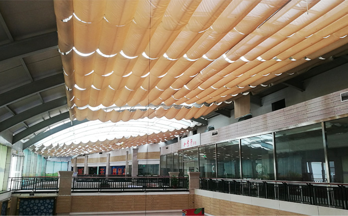 FCS天棚簾效果:天棚簾完全展開后,面料呈現(xiàn)均勻的波浪效果,收起時拉到一側(cè)。