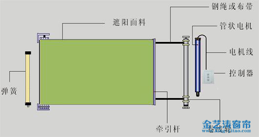 1、面料一端貼在裝有彈簧的卷管上,固定面料另一端的鋼繩卷取在裝有管狀電機卷管的卷線器上,電機提供面料運行的動力,彈簧提供回卷彈力,確保天幕簾在運行中或停止時向面料提供一定張力。